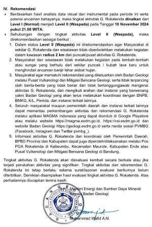 Untuk itu direkomendasikan  berdasarkan  hasil analisis data visual dan instrumental pada periode ini serta potensi ancaman bahayanya, maka tingkat aktivitas Gunung Rokatenda dinaikan dari Level 1 (Normal) menjadi Level II (Waspada) pada Tanggal 10 November 2024 pukul 21.00 WITA.